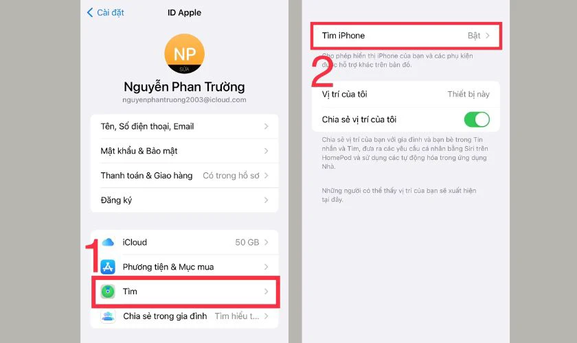Vô hiệu hóa tính năng Find My iPhone là một bước cần thiết khi bạn muốn bán hoặc cho tặng thiết bị của mình. Để bắt đầu, bạn hãy mở ứng dụng Cài đặt trên iPhone và nhấn vào ID Apple của bạn. Tiếp theo, tìm đến mục Tìm và chọn Tìm iPhone. Tại đây, bạn chỉ cần nhấn vào thanh gạt để tắt tính năng này.