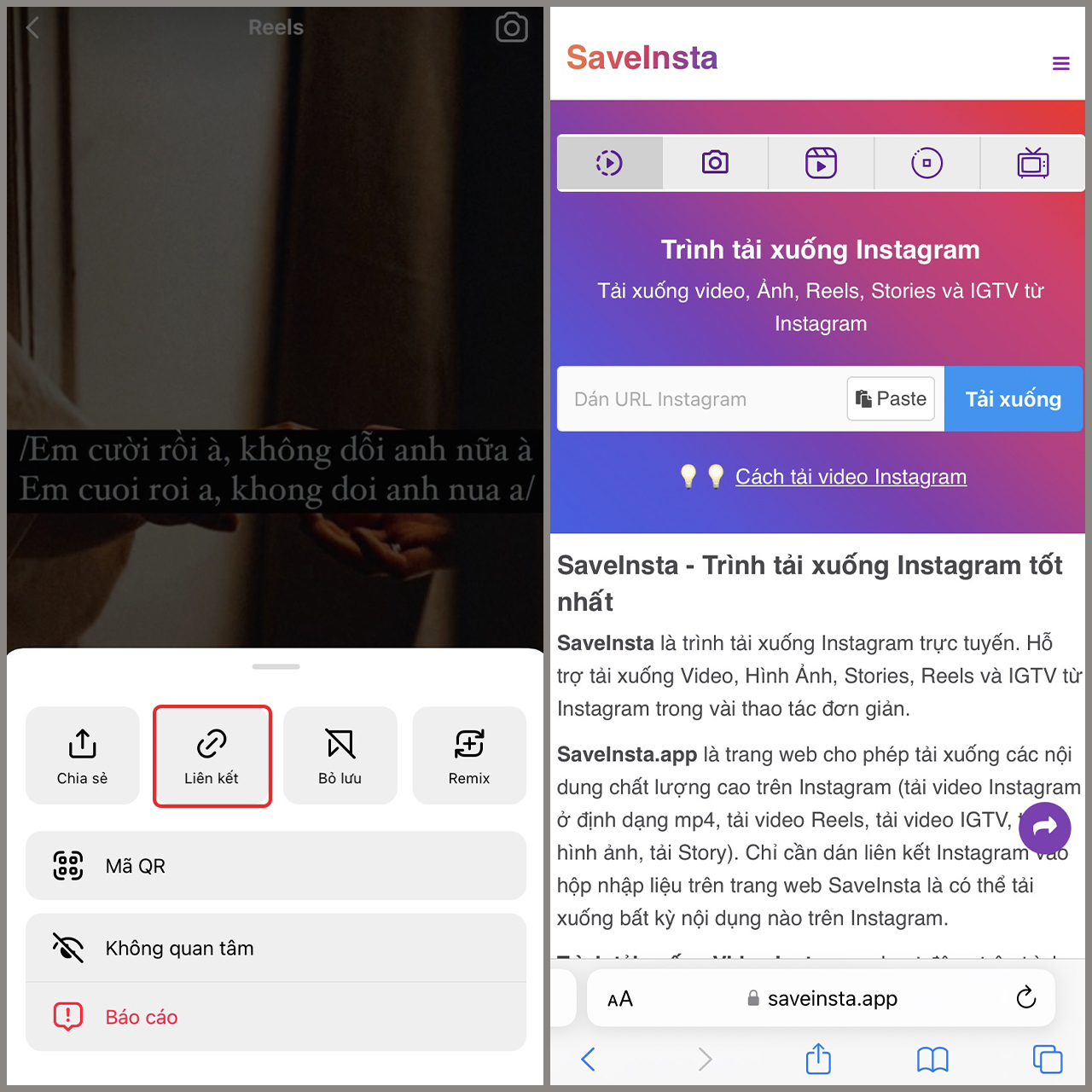 Sau khi đã có đường link, bạn hãy truy cập vào một trang web tải video như SaveFrom.net hoặc Snapinsta. Đây là những công cụ tuyệt vời giúp bạn tải Reels một cách đơn giản và nhanh chóng. Chỉ cần dán đường link vào ô trống trên trang web, sau đó nhấn “Tải xuống”. Chờ vài giây để video được xử lý và bạn sẽ có Reels yêu thích được lưu vào điện thoại.