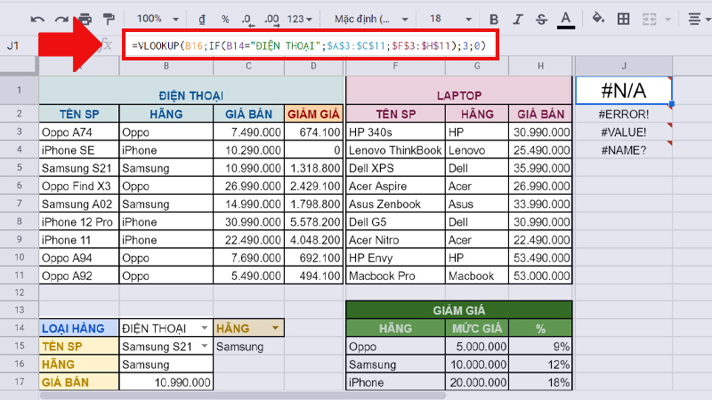 Tuy nhiên, việc kết hợp hai hàm này đôi khi gặp lỗi. Lỗi thường gặp nhất là #N/A khi VLOOKUP không tìm thấy giá trị, và nếu không được IF xử lý, lỗi này sẽ hiển thị trực tiếp. Ngoài ra, lỗi về tham chiếu ô hoặc phạm vi tìm kiếm không chính xác cũng là nguyên nhân phổ biến khiến công thức không hoạt động.