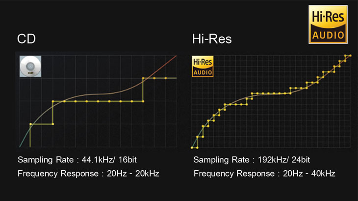 Các tệp âm thanh Hi-Res có thể có tốc độ mẫu lớn hơn 44.1kHz và độ sâu bit lớn hơn 16bit, cho phép tái sản xuất âm thanh trung thực và chân thật nhất. Mục tiêu của Hi-Res Audio là mang lại cho người nghe cảm giác như đang ở trong một buổi hòa nhạc thực thụ, nơi mà từng âm thanh đều được truyền tải một cách sống động.